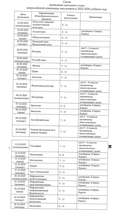 - Сроки проведения школьного этапа олимпиады по каждому общеобразовательному предмету в 2025-2026 учебном году (смотреть)